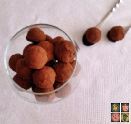 - Al día siguiente, primero, tamizar el cacao en polvo, reservar en un plato y con una cucharita pequeña o un saca-bolas, ayudándonos con los dedos, formar bolas, y rebozarlas con cacao en polvo.
